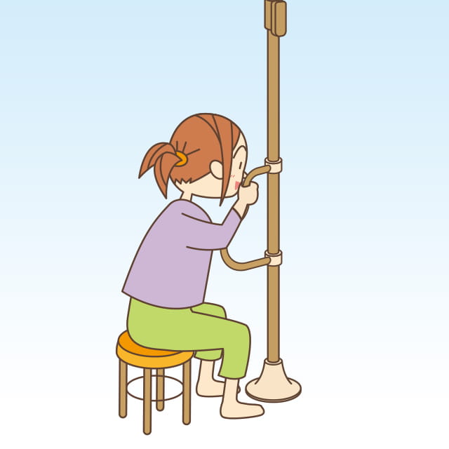 手すりの上部をつかんだまま膝を伸ばし立位をとります。